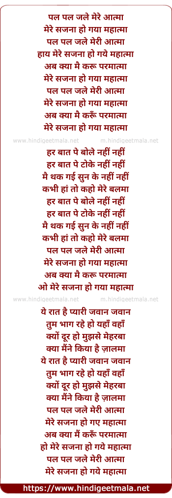 Lyrics of Pal Pal Jale Meri Aatma - पल पल जले मेरी आत्मा