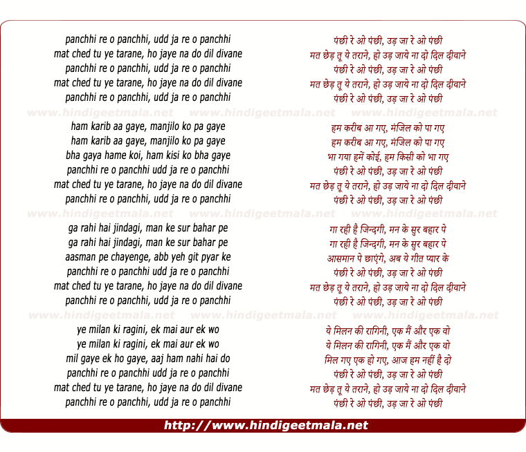 Lyrics of Panchchi Re O Panchchi - पंछी रे ओ पंछी