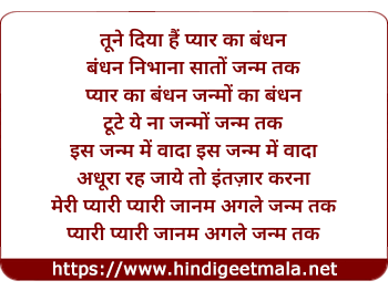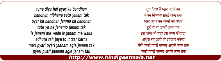 Lyrics of Tune Diya Hai Pyar Ka Bandhan Bandhan Nibhana - तूने दिया हैं प्यार का बंधन बंधन निभाना