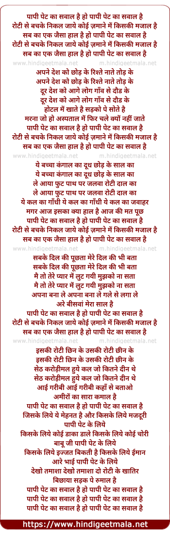 Poetic Translation - Lyrics of Papi Pet Ka Sawal Hai (Ii) - पापी पेट का सवाल है हो पापी पेट का सवाल है