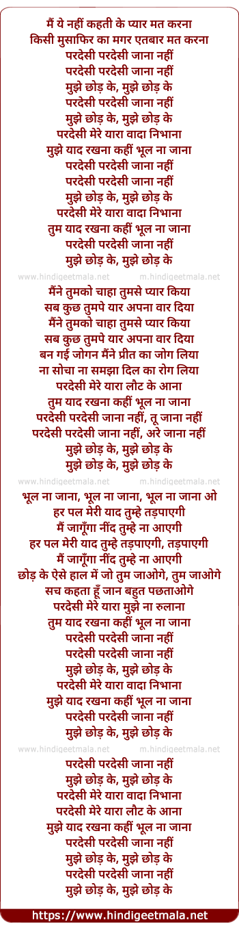 Lyrics of Pardesi Pardesi Jana Nahi, Mujhe Chhod Ke (Version II) - परदेसी परदेसी जाना नहीं मुझे छोड़ के