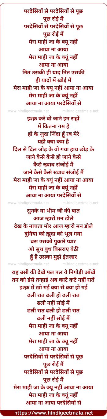 Lyrics of Pardesiyo Se Puchh Puchh Royi Main - परदेशियों से पूछ पूछ रोयी मैं