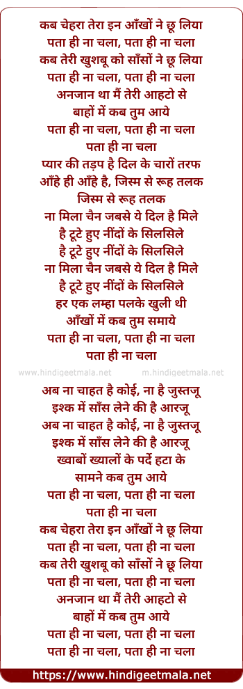 Lyrics of Pata Hi Naa Chalaa, Kab Chehara Tera - पता ही ना चला, कब चेहरा तेरा