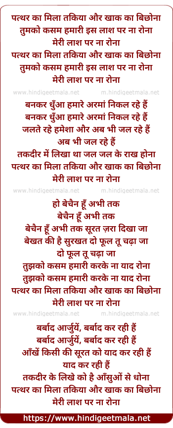 Lyrics of Pathar Ka Mila Takiya - पत्थर का मिला तकिया और खाक का बिछोना