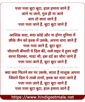 Patta Patta Boota Boota - पत्ता पत्ता बूटा बूटा, हाल हमारा जाने हैं