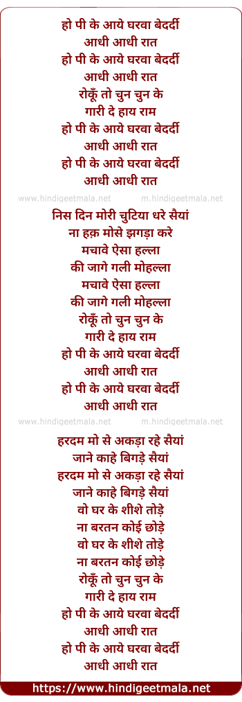 Lyrics of Pee Ke Aaye Ghar Bedardi Aadhi Aadhi Raat - पी के आये घर बेदर्दी आधी आधी रात
