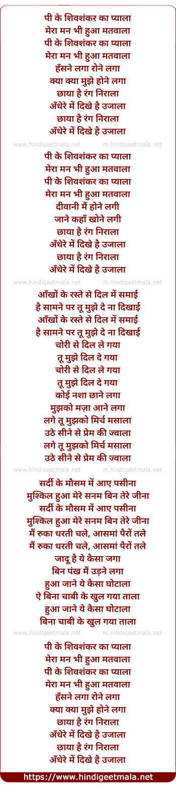 Lyrics of Pee Ke Shivashankar Kaa Pyala - पी के शिवशंकर का प्याला