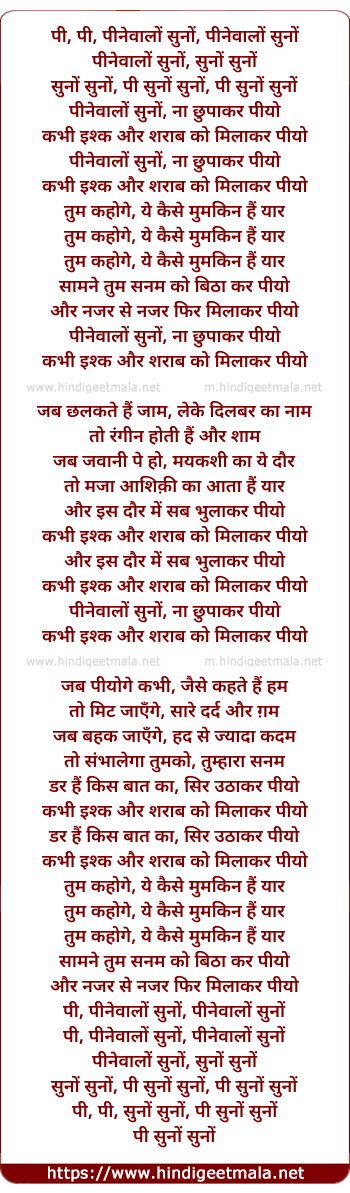 Lyrics of Pee Pinewalo Suno Pinewalo Suno - पी, पी, पीनेवालों सुनों, पीनेवालों सुनों