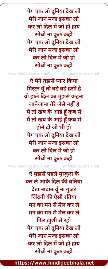 Lyrics of Peg Ek Lo Duniya Dekh Lo - पेग एक लो दुनिया देख लो