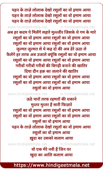 Lyrics of Pehn Ke Taje Lolak - पहन के ताज़े लोलाक देखो रसूलों का वो इमाम आया