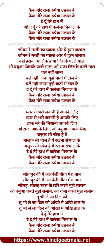 Lyrics of Phaink More Raja Rupaiya - फैंक मोरे राजा रुपैया उछाल के