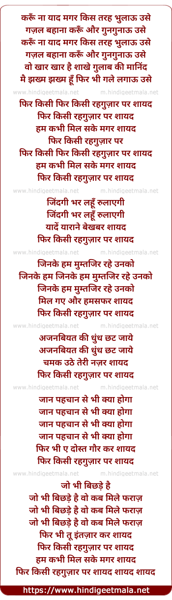 Lyrics of Phir Kisi Rahaguzar Par Shaayad - करूँ ना याद मगर किस तरह भुलाऊ उसे