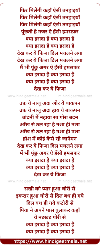 Lyrics of Phir Milengi Kaha Aise Tanhaiya - फिर मिलेंगी कहाँ ऐसी तन्हाईयाँ