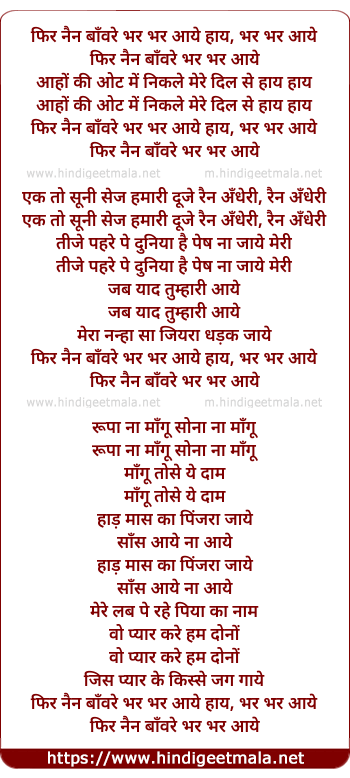 Lyrics of Phir Nain Banvare Bhar Bhar Aaye Hay - फिर नैन बाँवरे भर भर आये हाय