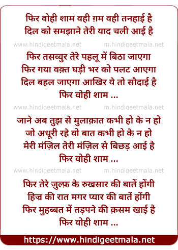 Lyrics of Phir Wohi Sham, Wahi Gham, Wahi Tanhai Hai - फिर वोही शाम, वही ग़म, वही तनहाई है