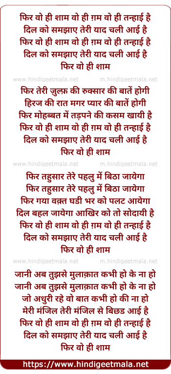 Lyrics of Phir Wohi Sham Wohi Gham Wohi Tanhai Hai - फिर वो ही शाम वो ही ग़म वो ही तन्हाई है