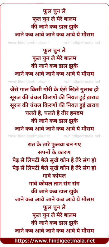 Lyrics of Phool Chun Le Mere Balam Ki Jane Kab - फूल चुन ले मेरे बालम की जाने कब