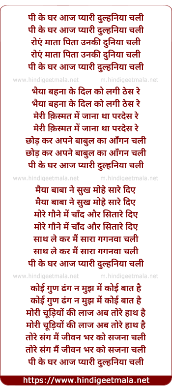Lyrics of Pi Ke Ghar Aaj Pyaari Dulhaniya Chali - पी के घर आज प्यारी दुल्हनिया चली