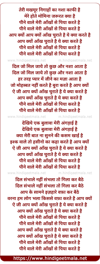 Lyrics of Pine Wale Meri Aankho Se Piya - पीने वाले मेरी आँखों से पिया