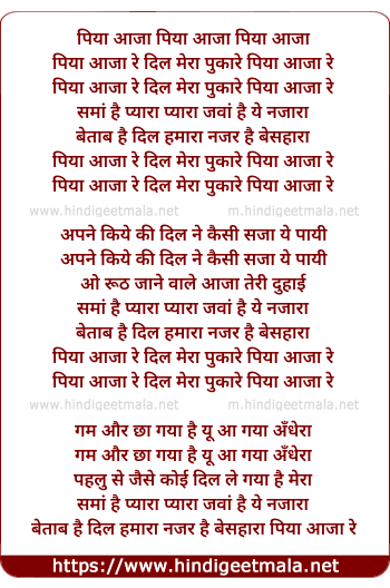 Lyrics of Piya Aaja Re Dil Mera Pukare - पिया आजा रे दिल मेरा पुकारे