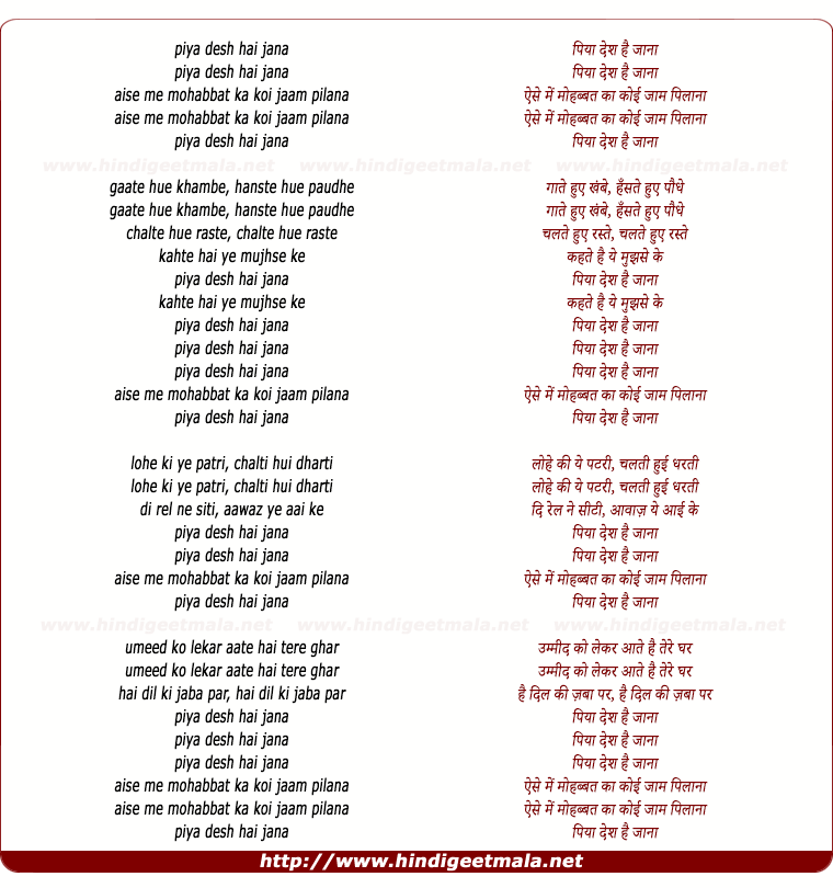 Lyrics of Piya Des Hai Jana - पिया देश है जाना