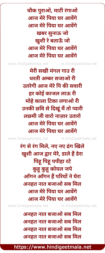 Lyrics of Piya Ghar Aavenge - चौक पुराओ, माटी रंगाओ