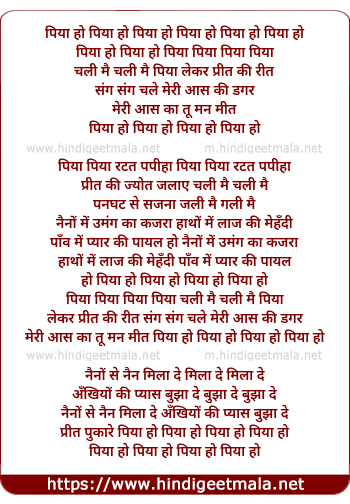 Lyrics of Piya Ho O Piya Ho - पिया हो ओ पिया हो
