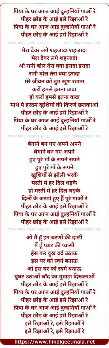 Lyrics of Piya Ke Ghar Aaj Aaye Dulhaniya - पिया के घर आज आई दुल्हनियाँ
