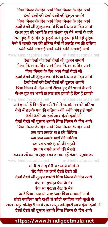 Lyrics of Piya Milan Ke Din Aaye - पिया मिलन के दिन आये