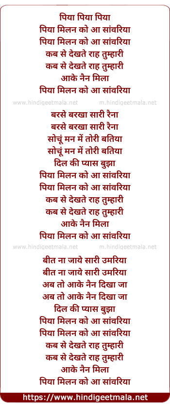 Lyrics of Piya Milan Ko Aa Saawariya - पिया मिलन को आ सांवरिया