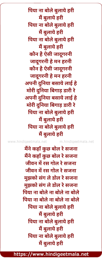 Lyrics of Piya Na Bole Bulaye Hari - पिया ना बोले बुलाये हरी