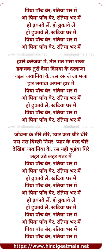 Lyrics of Piya Paanch Bher - पिया पाँच बेर, रतिया भर में
