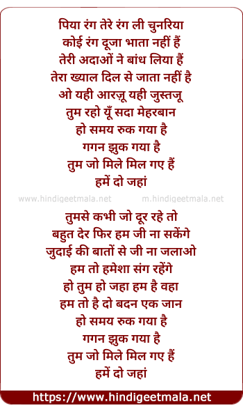 Lyrics of Piya Rang Tere Rang Li Chunariya - पिया रंग तेरे रंग ली चुनरिया