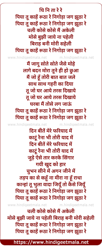 Lyrics of Piya Tu Kaahe Rootha Re - पिया तू काहें रूठा रे