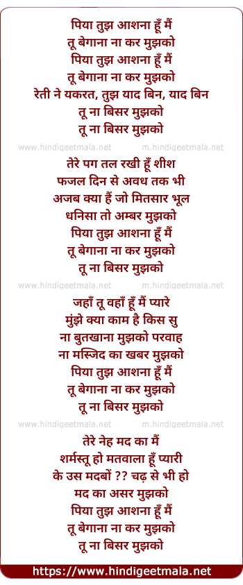 Lyrics of Piya Tujh Aashna Hoon Main - पिया तुझ आशना हूँ मैं