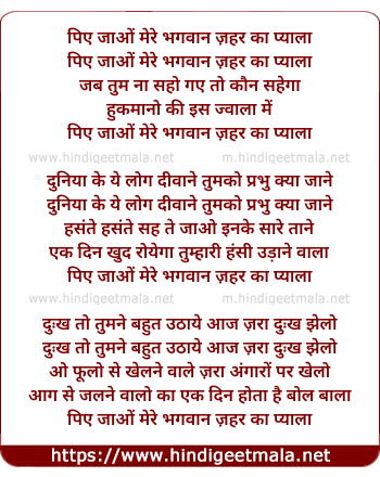 Lyrics of Piye Jaao Maine Bhagwan Zehar Ka Pyala - पिए जाओं मैंने भगवान ज़हर का प्याला