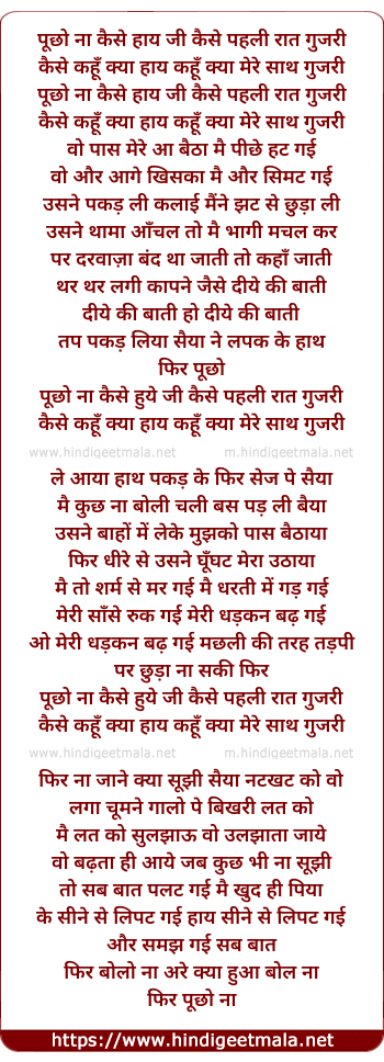 Lyrics of Poochho Na Kaise Haye Ji Kaise Pehli Raat Guzari - पूछो ना कैसे हाय जी कैसे पहली रात गुजरी