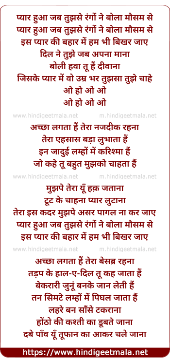 Lyrics of Pyaar Hua Jab Tujhse (Female) - प्यार हुआ जब तुझसे रंगों ने बोला मौसम से
