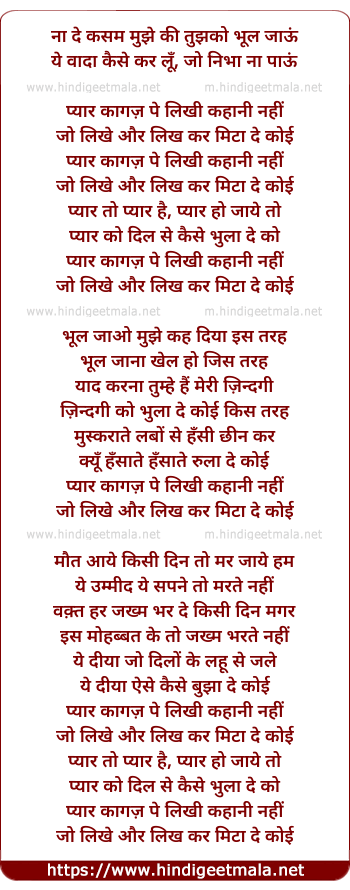 Lyrics of Pyaar Kaagaj Pe Likhi Kahaani Nahi (Female) - ना दे कसम मुझे की तुझको भूल जाऊं
