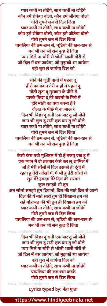 Lyrics of Pyar Kabhi Na Todenge, Sath Kabhi Na Chhodenge - प्यार कभी ना तोड़ेंगे, साथ कभी ना छोड़ेंगे