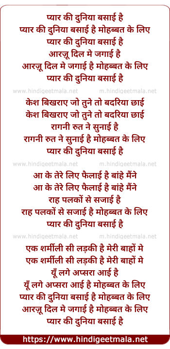 Lyrics of Pyaar Ki Duniya Basaayi Hai - प्यार की दुनिया बसाई है