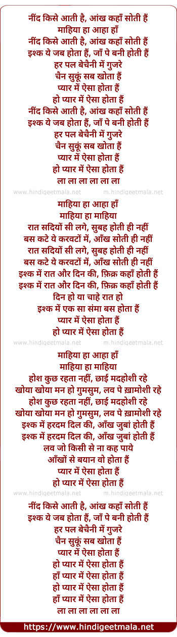 Lyrics of Pyaar Me Aisa Hota Hai (Ii) - नींद किसे आती है, आंख कहाँ सोती हैं