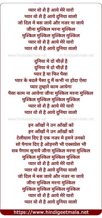 Lyrics of Pyaar Woh Shai Hai Ae Mere Yaaron - प्यार वो शै है ऐ मेरे यारो