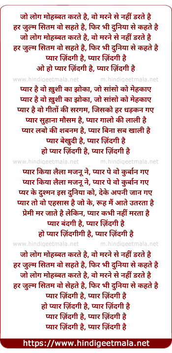 Lyrics of Pyaar Zindagi Hai - प्यार ज़िंदगी है
