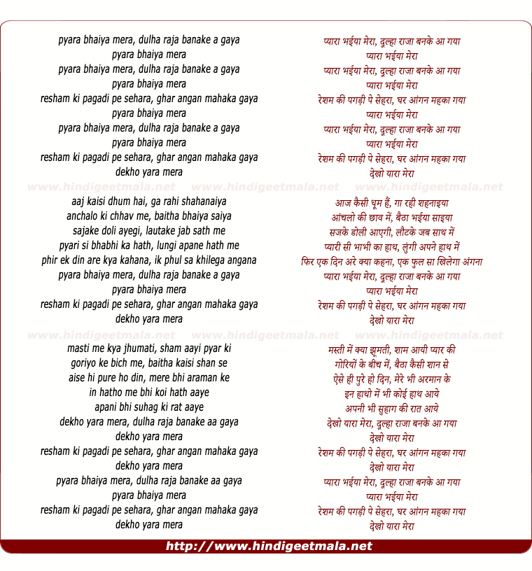 Lyrics of Pyaaraa Bhayyaa Meraa Dulhaa Raajaa Ban Ke Aa Gayaa - प्यारा भईया मेरा दूल्हा राजा बनके आ गया