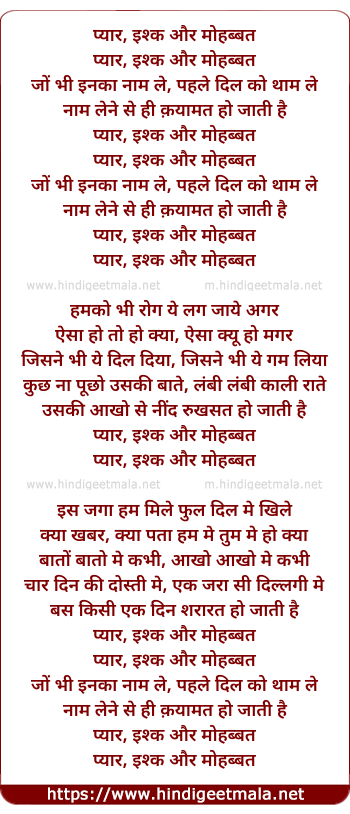 Lyrics of Pyar Ishq Aur Mohabbat - प्यार इश्क और मोहब्बत