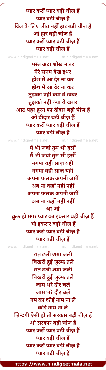 Lyrics of Pyar Karo Pyar Badi Cheez Hai - प्यार करों प्यार बड़ी चीज़ हैं