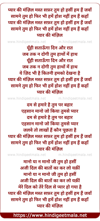 Lyrics of Pyar Ki Manzil Mast Safar Tum Ho Hasin Hum Hai Jawan - प्यार की मंज़िल मस्त सफ़र तुम हो हसीं हम हैं जवाँ