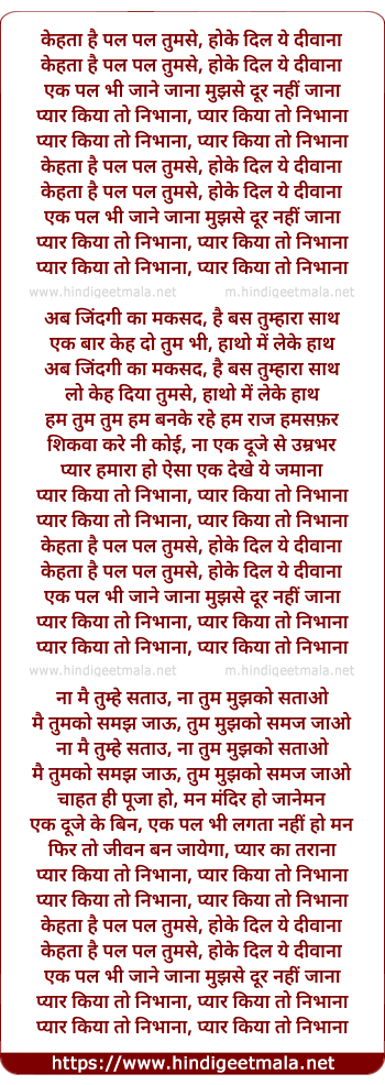 Lyrics of Pyar Kiya To Nibhana - प्यार किया तो निभाना