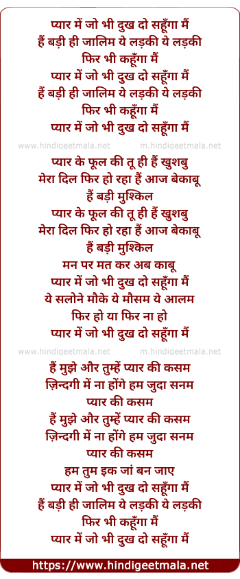 Lyrics of Pyar Me Jo Bhi - प्यार में जो भी दुख दो सहूँगा मैं